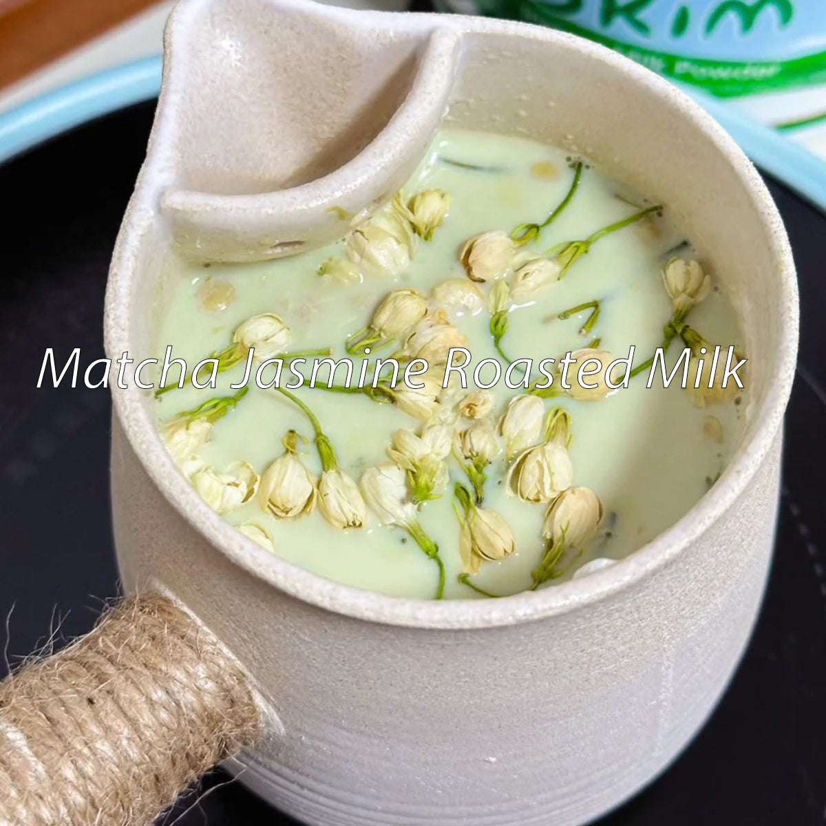 This handcrafted milk tea blends stone-ground matcha with roasted glutinous rice, jasmine tea, and dried jasmine, simmered gently with milk for a smooth, nutty, and floral cup. Deeply aromatic, comforting, and elegant.