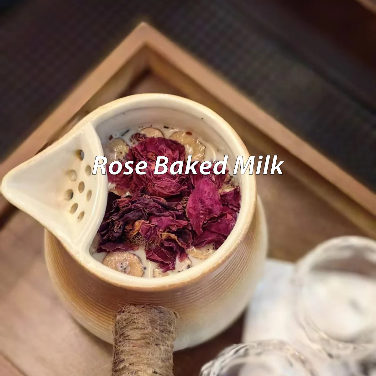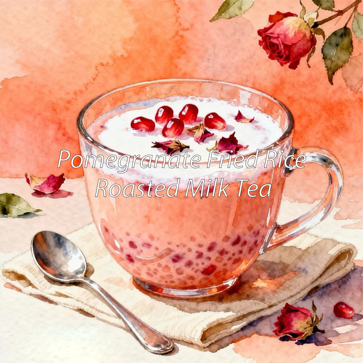 A creamy roasted milk tea infused with pomegranate, glutinous rice, and rose petals—softly sweet, floral, and beautifully comforting.