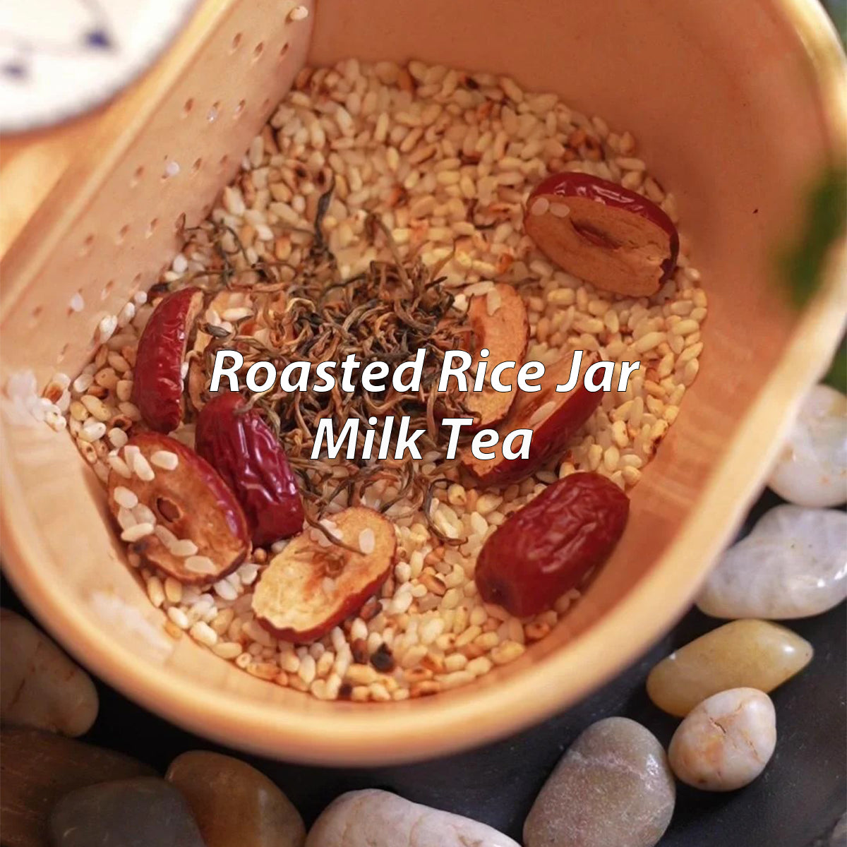 A cozy jar-brewed milk tea made with roasted rice, red dates, and Golden Bud black tea, offering deep toasty aromas and a softly savory finish.